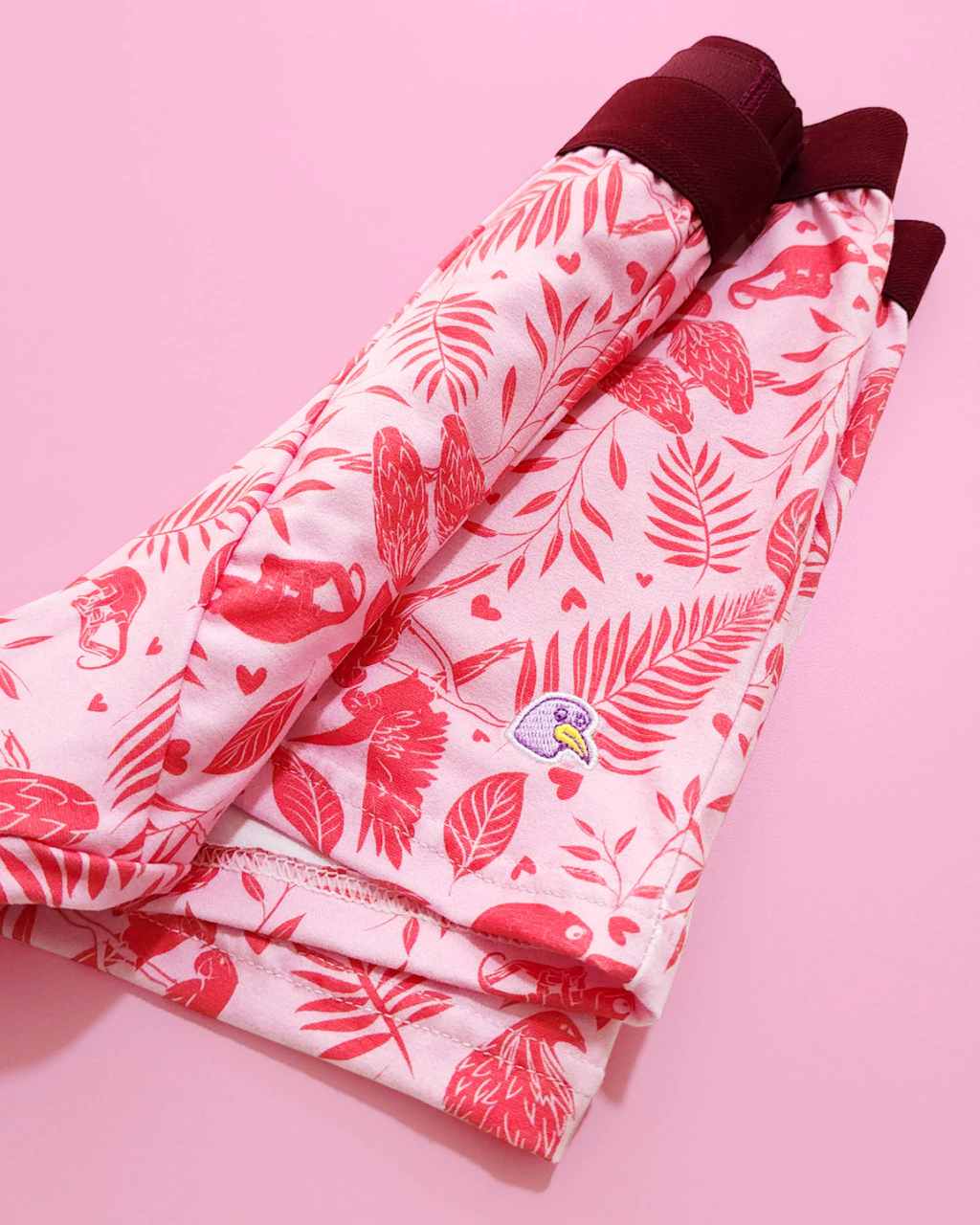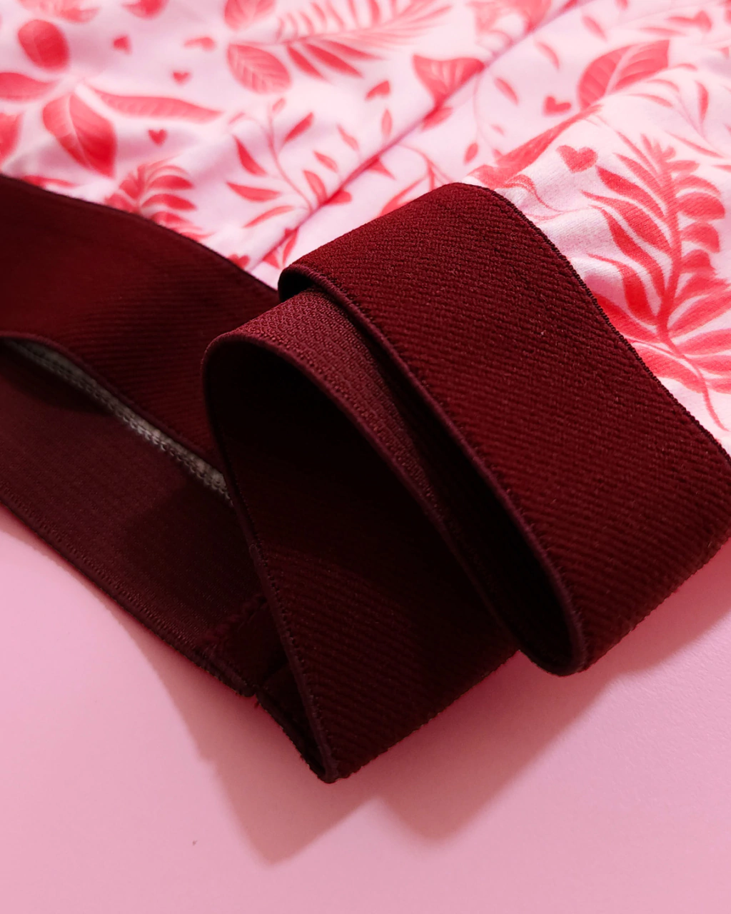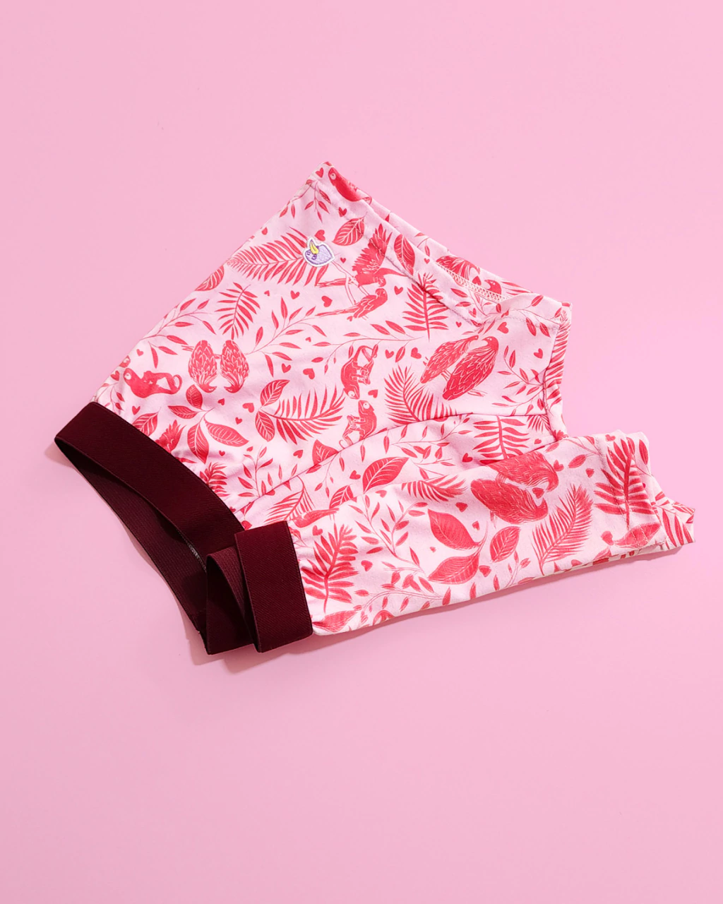 Boxer de algodón con lycra estampado en tonos rosas y rojos, con elástico afelpado color bordó en cintura.