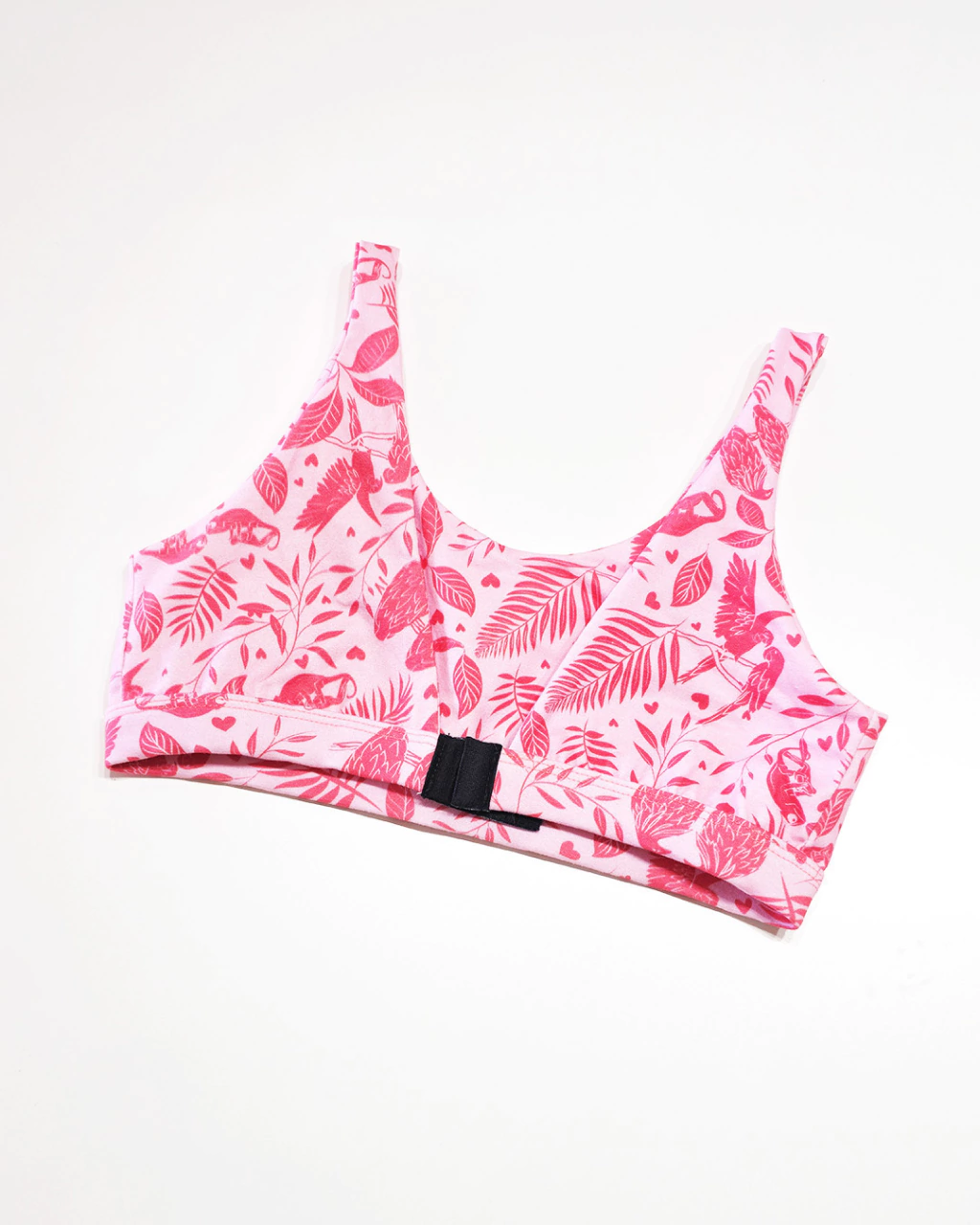 Top de algodón con lycra, con elástico oculto en cintura, estampado en tonos rojos y rosas.