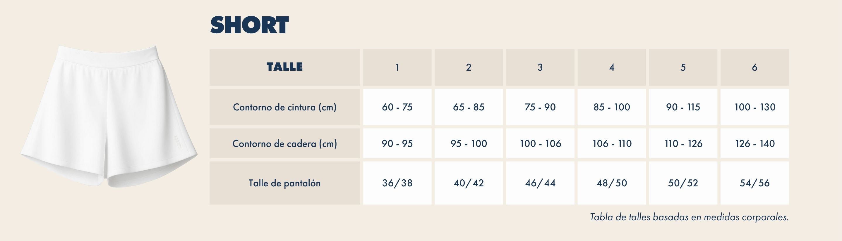 La comparativa con talles de pantalón es a modo de referencia. Los talles pueden variar según materialidad de las prendas, calce buscado, etc. Recomendamos siempre elegir el talle según las medidas corporales indicadas en la tabla.