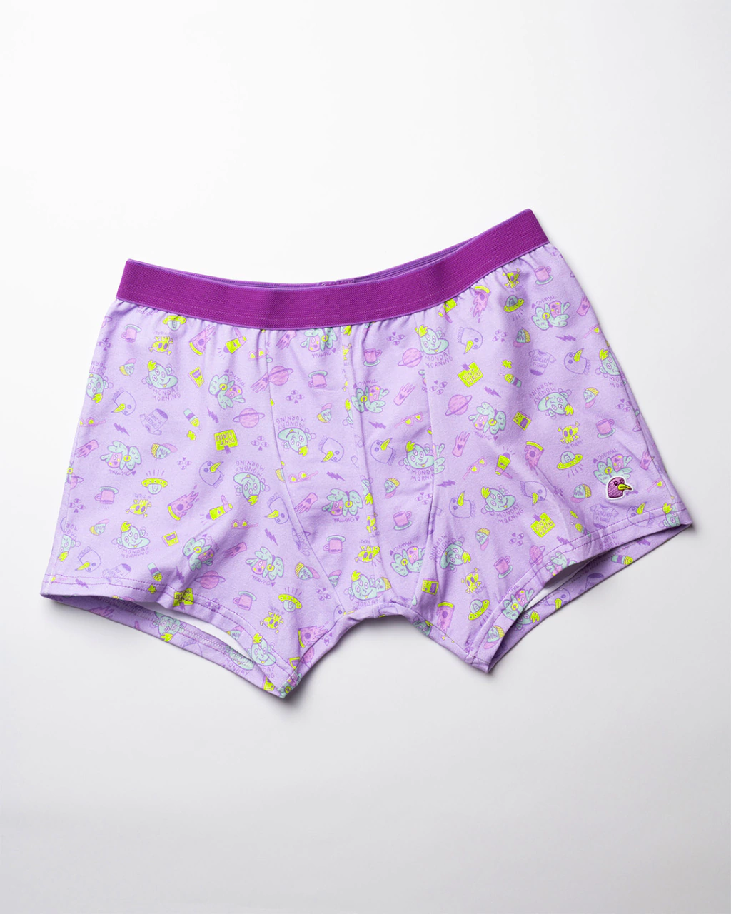 Boxer de algodón con lycra estampado con fondo lila; con elástico afelpado color violeta en cintura.