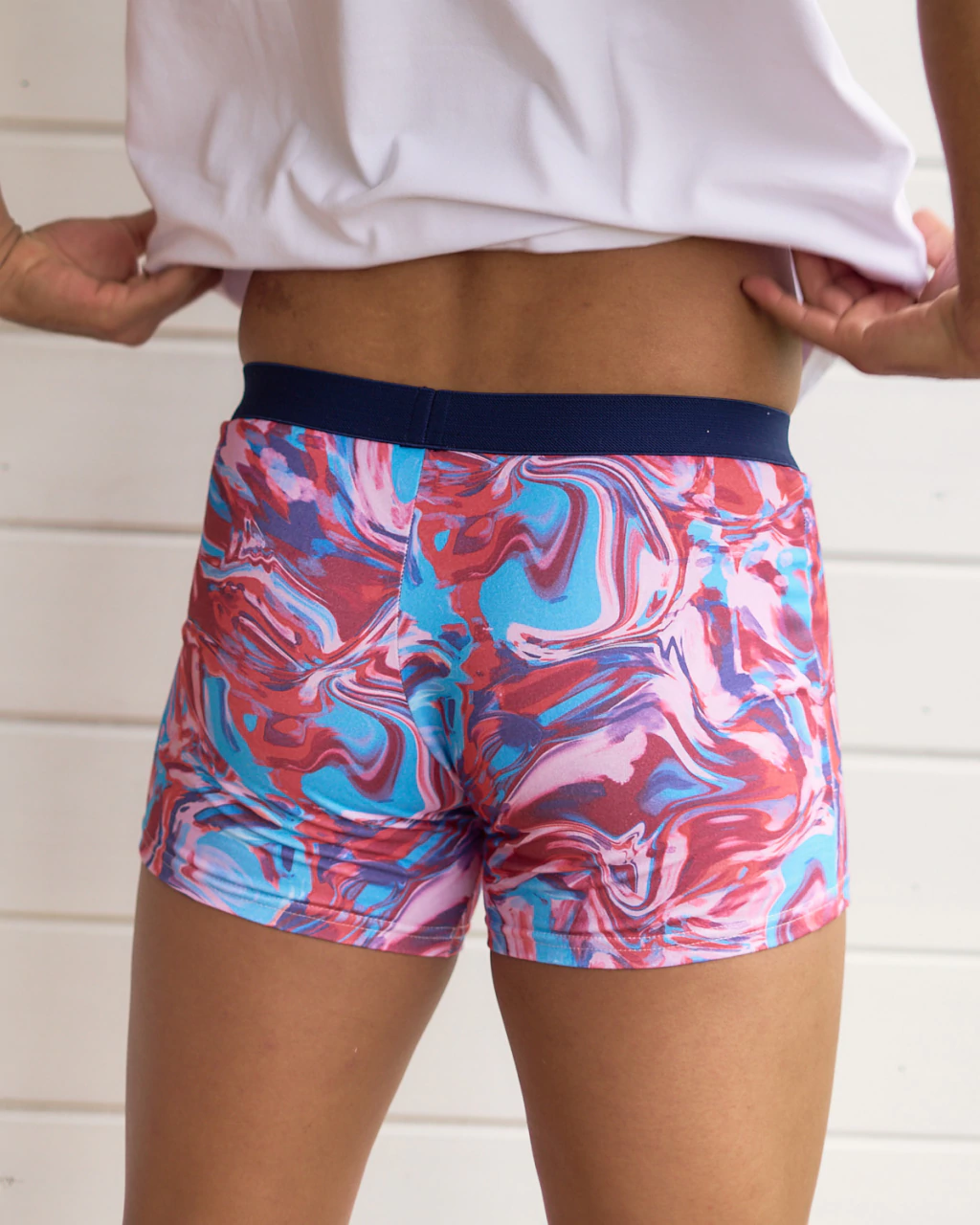 Boxer de algodón con lycra con estampa de en tonos rojos, celestes, rosas y azules, con elástico afelpado color azul marino en cintura.