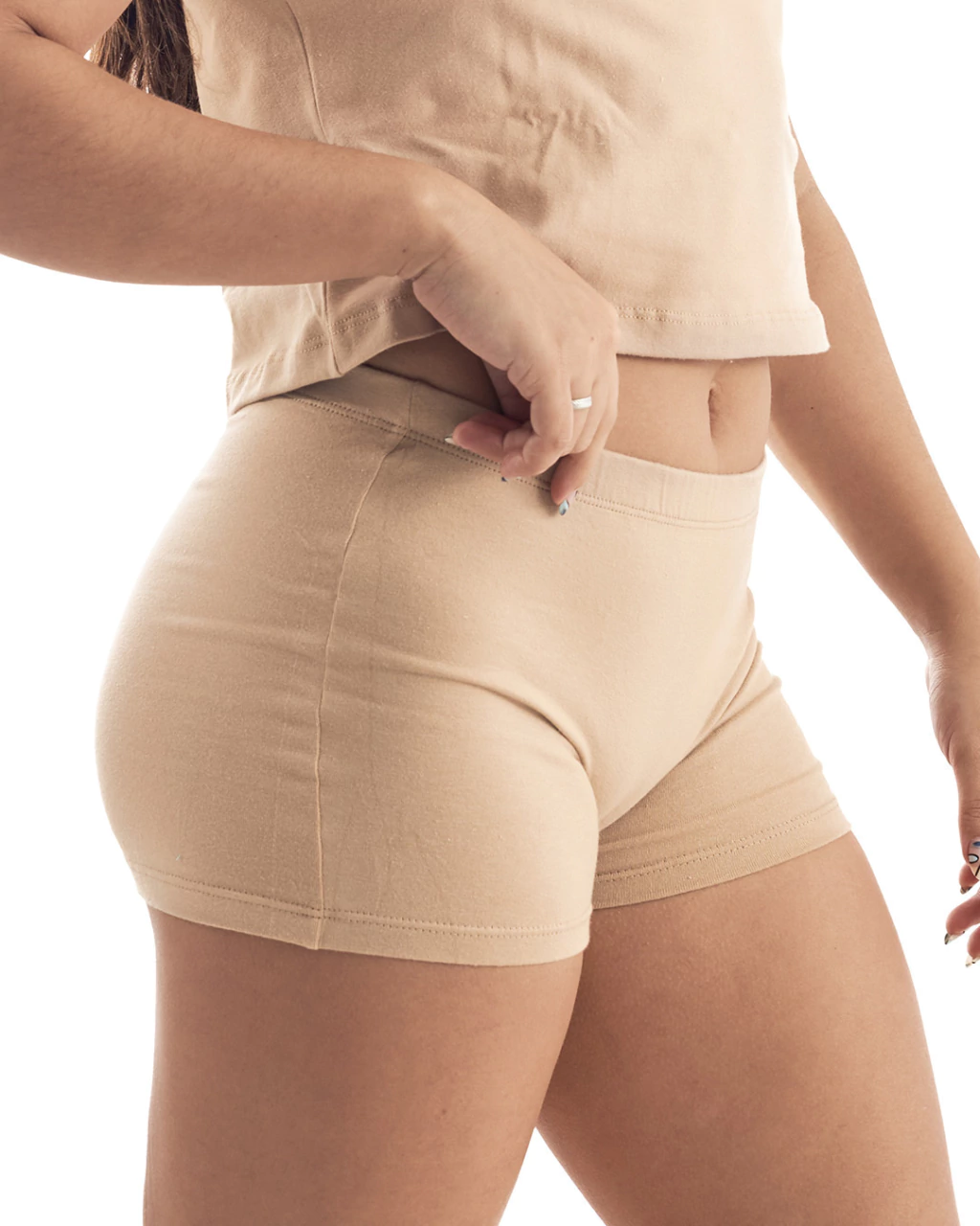 Bóxer para personas con vulva, de algodón con elastano tiro alto, anatómicas, con elástico embutido en cintura, de color beige.